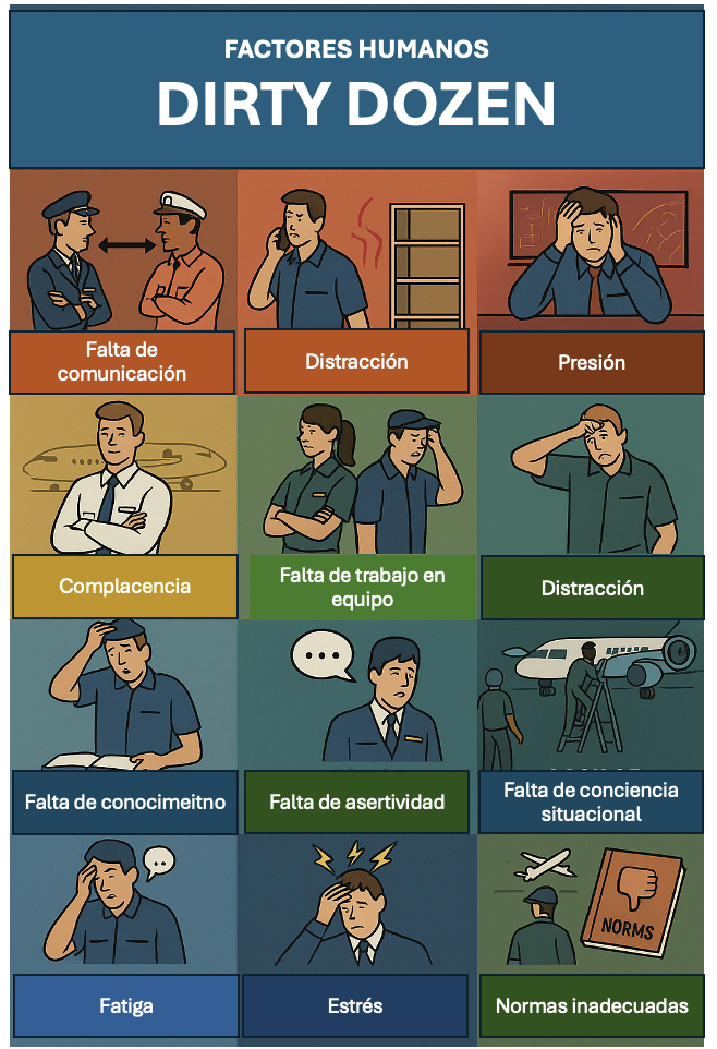 “The Dirty Dozen” es una herramienta diseñada para que pilotos, mecánicos, controladores y, en general, todo el personal aeronáutico identifique y gestione los doce factores humanos más comunes que pueden contribuir a la aparición de incidentes o accidentes.